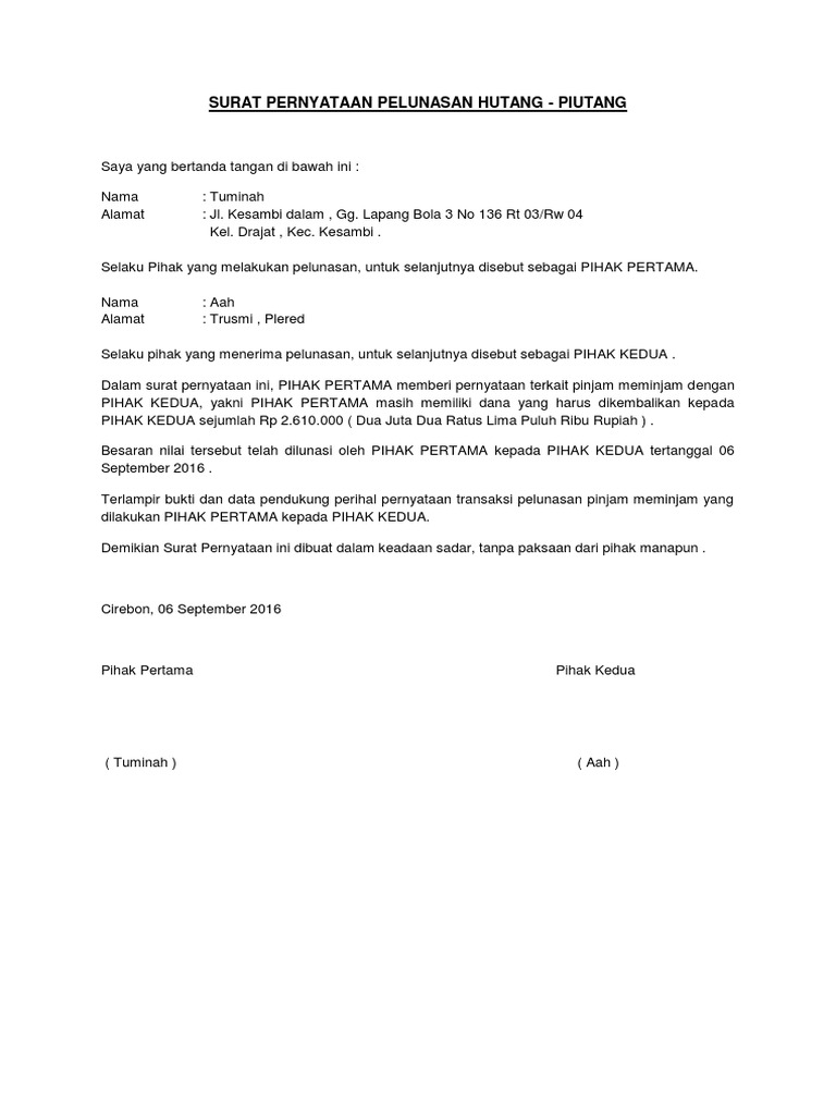 Penutup surat berisi ucapan terima kasih dan salam penutup. Contoh surat permohonan pelunasan hutang pada bank mp3 & mp4. Demikia demikian n surat surat perjanj perjanjian ian ini dibuat dibuat,, agar agar kelak kelak tidak tidak terjad terjadii sesuat sesuatu u diantara kedua belah pihak yang tidak diinginkan dan. Saya yang bertanda tangan di bawah ini, yang menyatakan sudah diterima pembayaran hutang yang berupa uang sejumlah rp. Dokumen ini penting untuk dibuat guna menghindari sekaligus menjadi dasar.